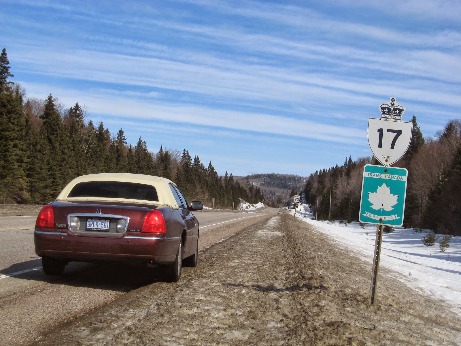 Texas Lincoln on the side of a long, Canadian road. Out on the Trans Canada Highway- a thin strip of pavement that's somehow supposed to connect the hearts, minds and finances of a great nation. Baking hot in the summer sun. Hot enough to blow tires off a truck. Hot enough that the moose come down to the road to get some relief from the bugs. Winter hides this road with ice, snow, with blue fear. Semi trucks own the whole damn thing. They've got lots of weight and lots of wheels on the ground. Push, push, push. Blind and ditch those little cars. Sometimes they ride this strip at night, like great metal insects, tires moaning, eyes shining strange. In packs, tight like a train until one slides and dumps the bunch in a burning pyre of ditch rubble. Plenty of little crosses on the side of this trail. Plenty of time to think about it. About hitting the rock wall. About the tight ice curve at the bottom of another hill. But this day is early spring. Easter weekend. This is my road. My memories. I stop on the shoulder and there is no other traffic. Quiet. Dead quiet. After five minutes I get back in and drive. I've got a few hundred more miles to Thunder Bay, ON.